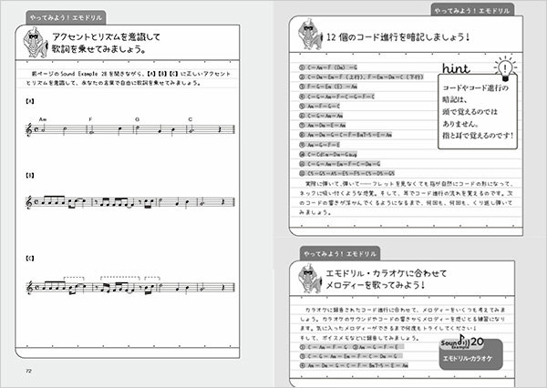 さらに、本書には所々に「エモドリル」というワーク形式の課題がたくさん登場します。アクセントを意識して例題のメロディに歌詞を載せてみたり、試聴音源のエモドリル・カラオケに合わせて鼻歌でメロディを歌ってみたり、必須の12個のコード進行を丸暗記してみたり。
