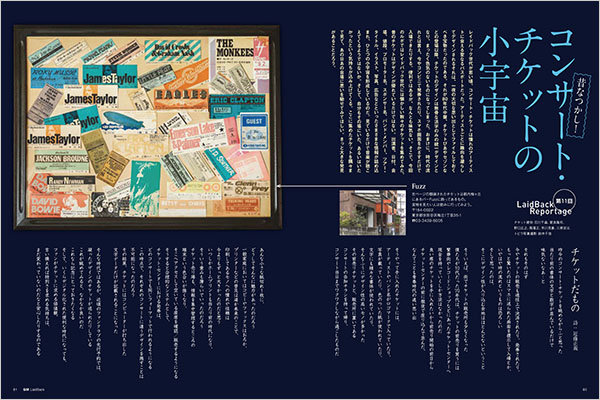 レイドバック世代が若い頃、コンサート・チケットはアーティストごとに趣向を凝らしてデザインされる愛すべきものだった。それが80年代中盤以降、無骨な活字のみの統一デザインとなり、まったく色気のないものになってしまった。そこで、今回のルポでは昔なつかしいチケットをたくさん集めてみた。そこには出演者、日付、会場、値段、プロモーター名、バンド・メンバー、ツアー・タイトルなどさまざまな情報が詰め込まれ、ひとつの小宇宙を形成している。そんなチケットを隅々まで見て、あの日あの会場に思いを馳せてみてほしい。きっと大きな発見があることだろう。
