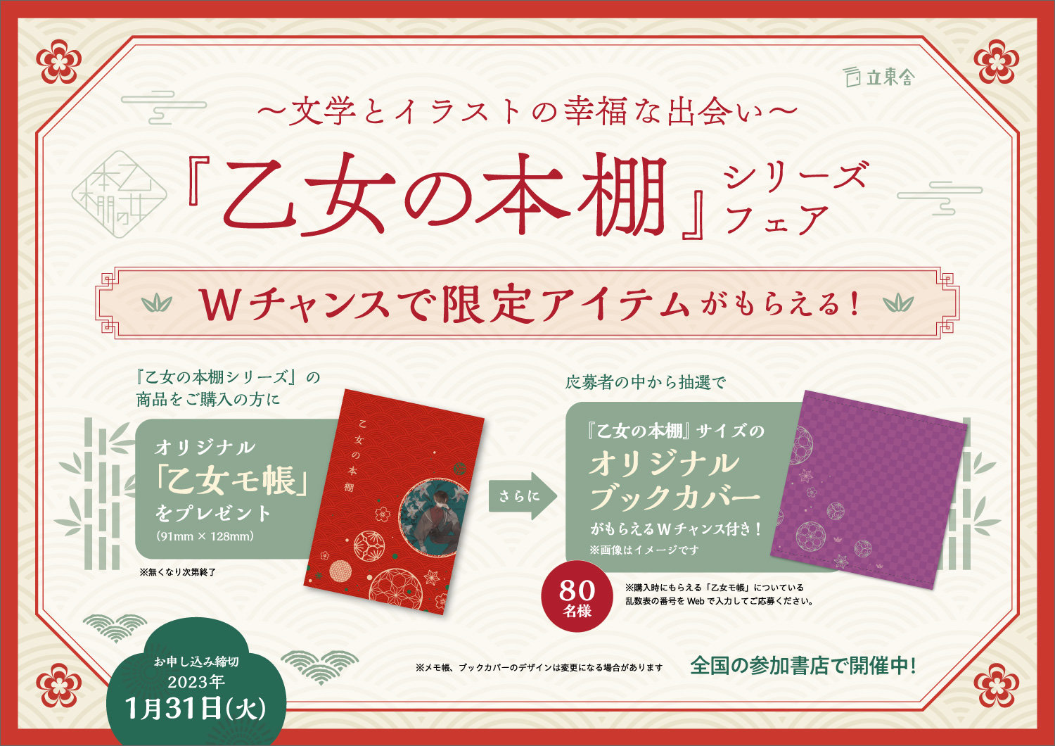 さらに、抽選で80名様に乙女の本棚サイズのオリジナルブックカバーが当たるプレゼント企画もご用意しております!