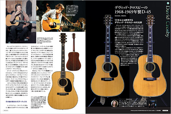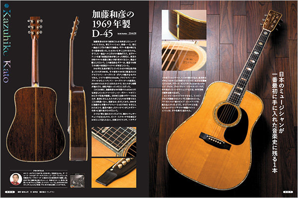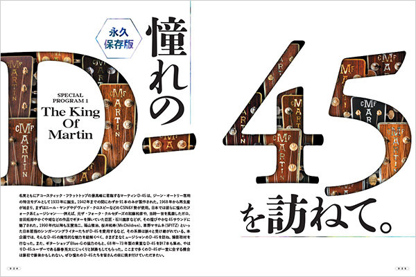 メイン特集は、名実ともにアコースティック・フラットトップの最高峰に君臨するマーティンD-45。このギターは、シンギング・カウボーイと呼ばれたジーン・オートリー専用の特注モデルとして1933年に誕生し、1942年までの間にわずか91本のみが製作されました。今やそのオリジナルの価値は1本数千万円と言われています。