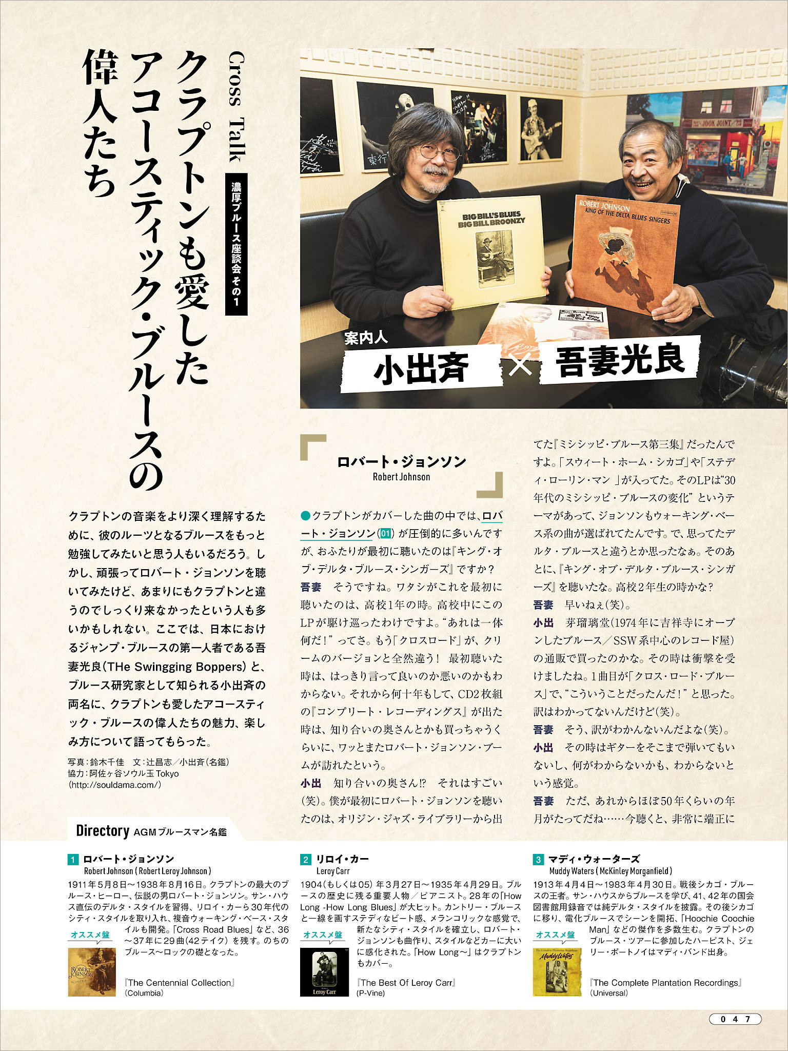 表紙巻頭の特集では、外国人として初の日本武道館100回公演を遂げたエリック・クラプトンのルーツに迫るアコースティック・ブルースを大フィーチャー。ヤードバーズやブルース・ブレイカーズ時代を含めると半世紀以上にわたって日本のギタリストに影響を与え続けてきたクラプトンですが、彼がカバーした「クロスロード」や「ハイダウェイ」を入り口に、多くのギタリストがロバート・ジョンソンやフレディ・キングなどのブルース・ヒーローを追いかけ、深淵なるルーツ・ミュージックの世界へと足を踏み込んでいきました。クラプトンへの理解をさらに深めるべく、ロバート・ジョンソンを始め、ビッグ・ビル・ブルーンジーやエルモア・ジェイムス、リロイ・カー&スクラッパー・ブラックウェル、スキップ・ジェイムスなど、彼が愛したアコースティック・ブルースマンをたっぷりと紹介しています。