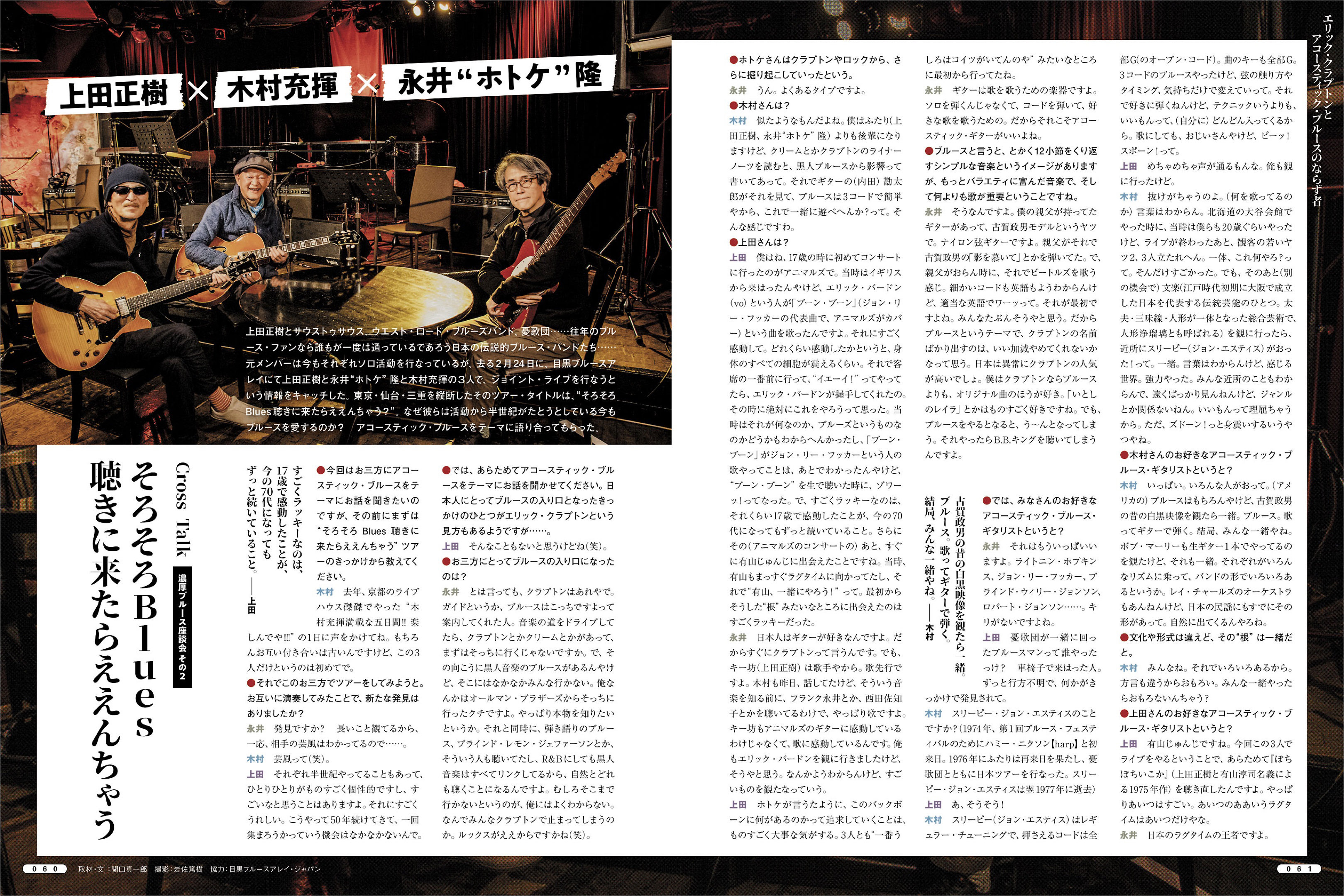 また、同特集では、1970年代から活躍する日本を代表するブルースマン......内田勘太郎(憂歌団)、木村充揮(憂歌団)、上田正樹(サウストゥサウス)、永井"ホトケ"隆(ウエスト・ロード・ブルース・バンド)、吾妻光良(The Swinging Boppers)、小出斉(ローラーコースター)といたレジェンドが、各々のクラプトン感、今だからこそ後世に伝えたいブルースへの熱い想いを語っています。クラプトン好きの人もそうでない人も、本特集をきっかけにもう一度ブルースと向き合ってみてはいかがでしょうか。