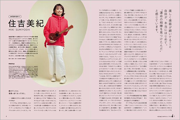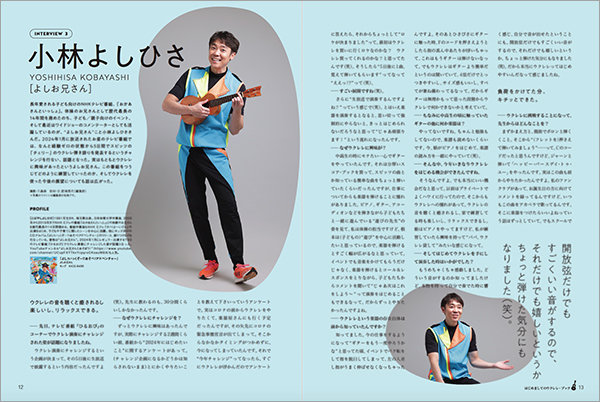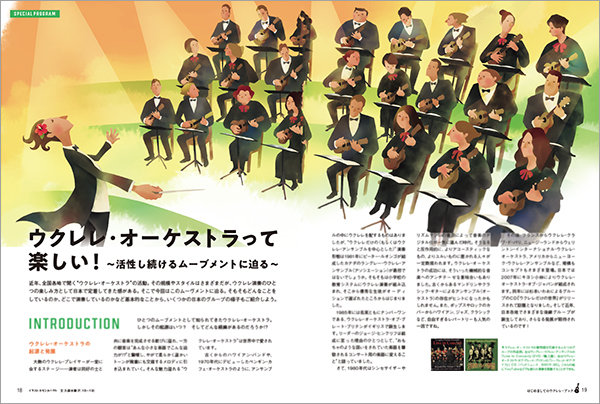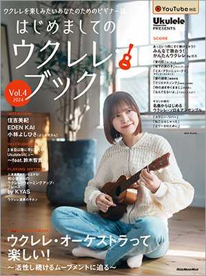 『はじめましてのウクレレ・ブック』とは、夏と冬、年2回刊行している『ウクレレ・マガジン』よりももっとビギナーに特化した年1回刊行ムック。ウクレレ・アーティストのみならず、ライトにウクレレを楽しむ著名人のインタビューや、ハードウェア情報、楽譜などのウクレレ情報をお届けしています。今回は、近年楽器を手にしたばかりのフリーアナウンサー、住吉美紀さんや体操のお兄さんとして現在も活躍している"よしお兄さん"こと小林よしひささんがインタビューに登場。ウクレレを手にして新たに見えた目標などを伺いました。他にも"ウクレレ・オーケストラ"に迫るなど、ウクレレのさまざまな魅力を紹介しています。