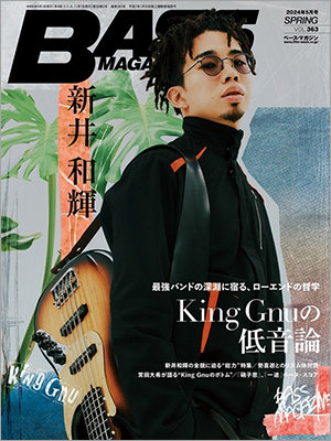 ベース・マガジン2024年5月号の表紙巻頭はKing Gnuの新井和輝! 自身への総力特集を始め、バンド・メンバーの勢喜遊や常田大希もフィーチャーし、多角的に"King Gnuの低音論"に迫る!