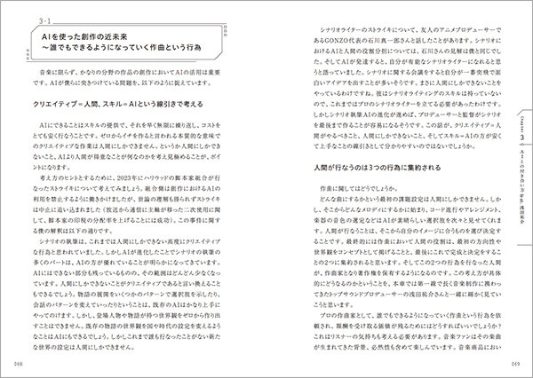 本書では、音楽事務所でキャリアをスタートし、「山口ゼミ」で多数の作曲家を育成、現在ではエンターテック・エバンジェリストとしてエンタメ領域での起業を推進している山口哲一氏が、冷静な現状分析を踏まえクリエイターの「これからの生き方」を提示します。また生成AIツールを紹介するChapter3「AIとの付き合い方」では、サウンドプロデューサーの浅田祐介氏の協力を得て実際のツールの使い方や、そこから見えてくる未来を展望。その未来とはディストピアなのでしょうか、それとも......?