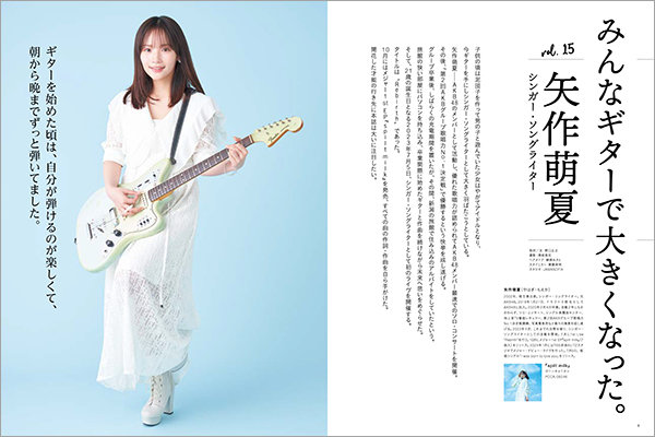 AKB48の元メンバーで、今はシンガー・ソングライターとして活躍する矢作萌夏を表紙巻頭でフィーチャー。AKBではセンターを務めた経験も持つその歌唱力は本物で、ギター愛も並々ならぬものがある。ギターについて、曲作りについて、将来についてなど詳しく聞いた。