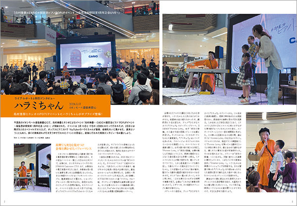 巻頭【ライブ・レポート&特別インタビュー】では、イオンモール幕張新都心で開催された「島村楽器×CASIO#部屋活ピアノPOPUPイベント」の模様と、ポップスピアニストで人気YouTuberのハラミちゃんによる「即興のスペシャルメドレー」のライブ・レポート&特別インタビューをお届けします。イベント当日に披露したハラミちゃんピアノ演奏動画「二次元コード」付き!