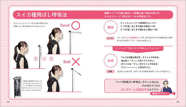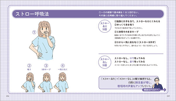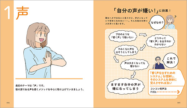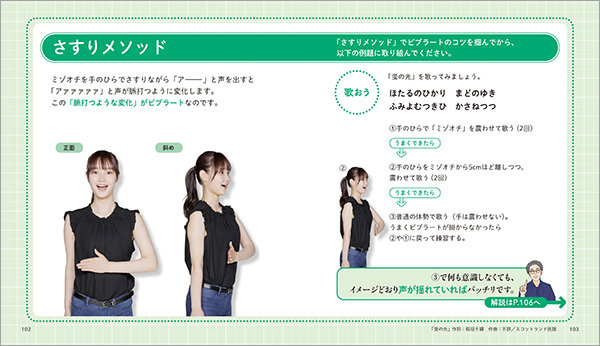最大の特徴は、歌や発声の悩みに効くメソッドをシンプルに伝えていること。大きなイラストや写真を使い、すぐに実践できる練習方法をどんどん提示していきます。まずやってみて、その効果を体感してから、「それはなぜ?」という検証や考察についてフォローアップしていく展開となっていますので、頭で考えるよりも先に身体を動かし、声を出していきましょう!