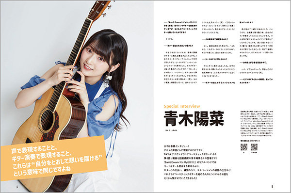 巻頭には、アニメ『BanG Dream! It's MyGO!!!!!』の要楽奈役などで活躍中の人気声優・青木陽菜さんが登場。巻末には、弦の交換方法やギターコード早見表などのお役立ち情報が掲載されています。まさに、入門者・初心者の必携の仕上がりです!