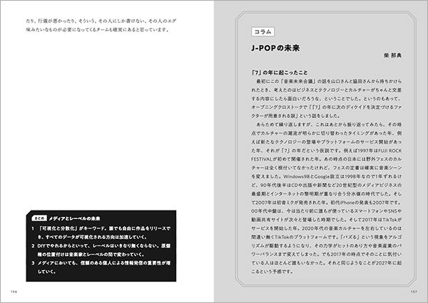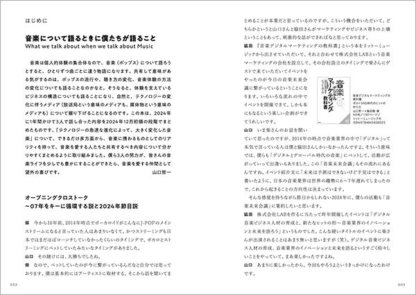 本書では音楽ジャーナリストの柴那典、エンターテック・エバンジェリストの山口哲一、音楽マーケティングスタートアップ株式会社LABの代表・脇田敬の3人が、それぞれの経験から「ヒットとブレイクの10年」「ライブとフェスの10年」「メディアとレーベルの10年」「マネーとクリエイトの10年」という4つのテーマについて語り合い、音楽シーンや音楽業界の未来を見据えています。立場の違いを超えてときに呼応し、ときに意見を異にしながら縦横無尽に豊富なトピックを俎上に載せ熱い議論が交わされるさまは、まさに刺激的な音楽の未来を予感させるものとなっています。書籍のもとになった計4回の「音楽未来会議」の熱量が、そのまま再現されているといえるでしょう。