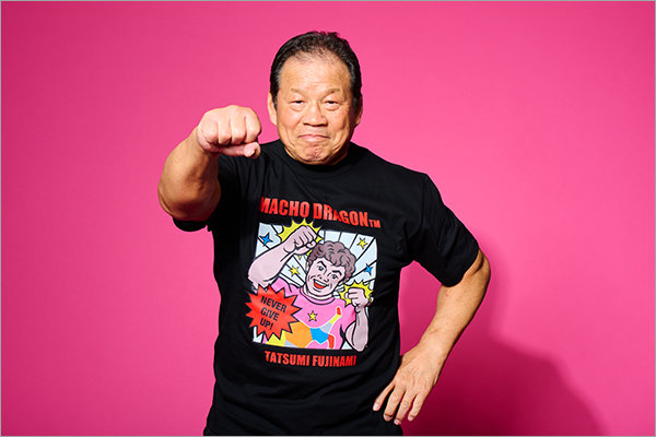 藤波辰爾コメント「このTシャツを見た瞬間に直感で『いいな!』と思いました! カッコ良く描いていただいて嬉しいですね。試合会場やイベントでマッチョ・ドラゴンTシャツを着ている人は、自然と僕の目に飛び込んでくるんですよ。今年の夏はこのTシャツを着て、みんなでマッチョ・ドラゴンになろう!」