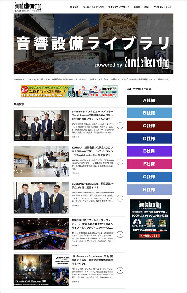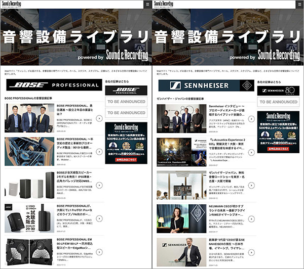 このたび、導入事例のみならず製品情報、展示会情報、メーカー紹介など、年々高まる音響設備情報を集約すべく、Webサイト「サンレコ」内に音響設備に関するポータルページ「音響設備ライブラリ」(https://www.snrec.jp/onkyosetsubi)をオープンしました。