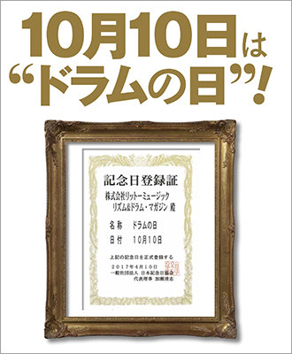 2017年に制定された10月10日のドラムの日は、ドラマー視点からドラム・セットを見たときの"スティック・スネア・スティック・フロア・タム"の構図を取ったもので、ドラマーはもちろん、すべての楽器にまつわるプレイヤーが"ドラム"で盛り上がる日にしたいという思いを込めて申請。日本記念日協会に認定されたオフィシャルの記念日となります。