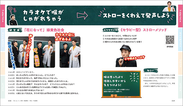 上記4タイプ別に陥りがちな発声を原因とする歌唱の壁を、ちょっとしたコツや独特な手法を使って改善していくもの。これを動画でお馴染みの1話1分程度の軽妙なやり取りを通して楽しく読み進めることができます。それぞれにレクチャーのもととなる参考動画のリンクもQRコードで記載されているので、音や動きでも確認が可能です。