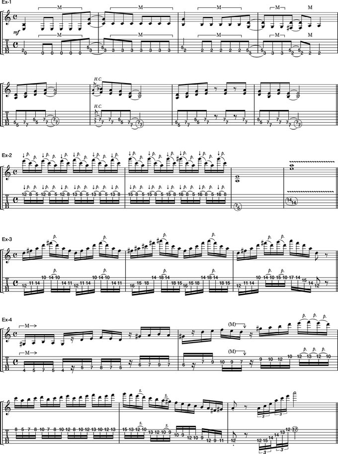 今回は最終回ということで、いろいろな応用技を盛り込んだ譜例に挑戦していきましょう! 王道ロックからネオ・クラシカルなどのテクニカルなロックまでのフルコースです。これまでと違い、ひとつの譜例に複数の注意点が出てくるので、じっくりゆっくりマスターしていきましょう。また、ライトハンド・タッピングに関しては、私は最近、指ではなくピックでタッピングをすることが多いので、そちらで動画を撮影しました。使いどころは曲によるのはもちろんですが、ピックの方が数段速く弾くことができるので、おすすめです。ほかにも、譜面や説明だけではわかりづらいタイトさや表現力に関する部分も、ぜひ動画で確認してみて下さいね。