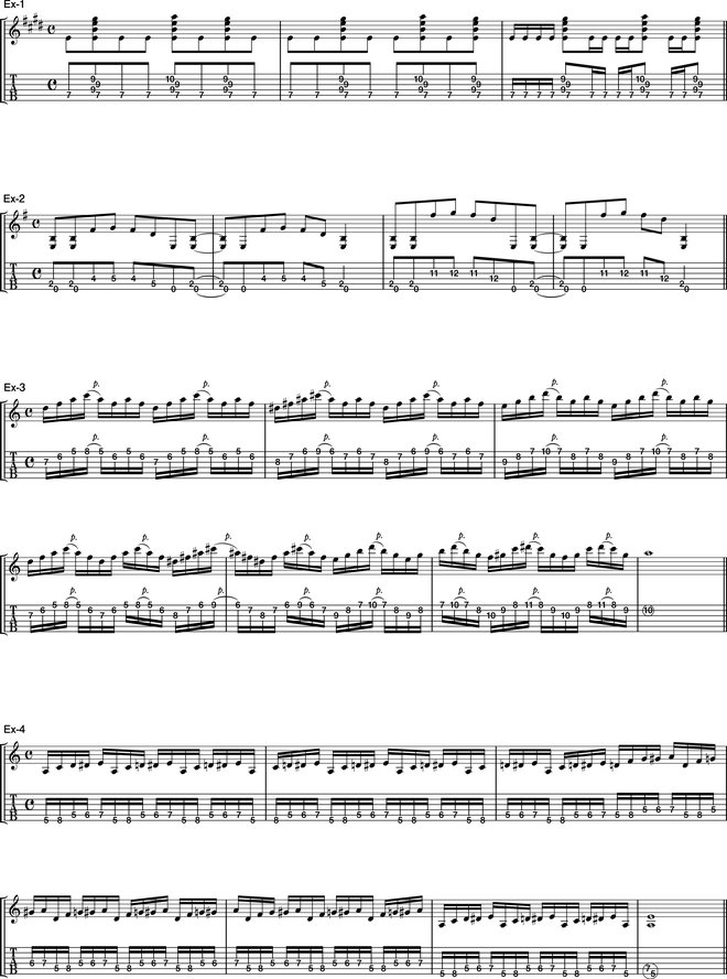 続くEx-2は、パワーコードとシングル・ノートをミックスした1小節目のリフをモチーフに使用します。このモチーフを倍にして、間をタイでつなぐことでひとつのメイン・リフを完成させています。後半の2小節では、オクターブ上の音階を使うことにより、さらに変化をつけています。困った時はオクターブ! 単調になりがちなリフにスパイスを与えてくれて、使いやすいので重宝しますね。リード部分にハモりをつけてみるとさらにカッコいいリフの完成間違いなしですね。