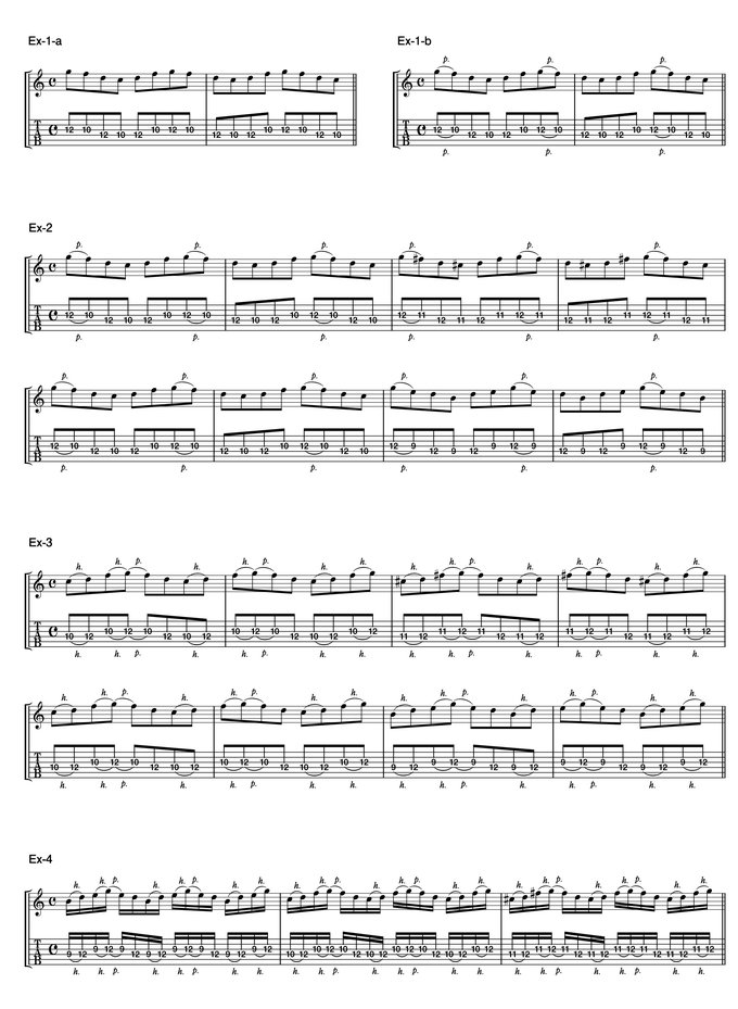 Ex-1-bは、先ほどのEx-1-aにハンマリングに加えたものです。リズムがヨレやすいので注意して、ここで一気にスピードアップしてみましょう!