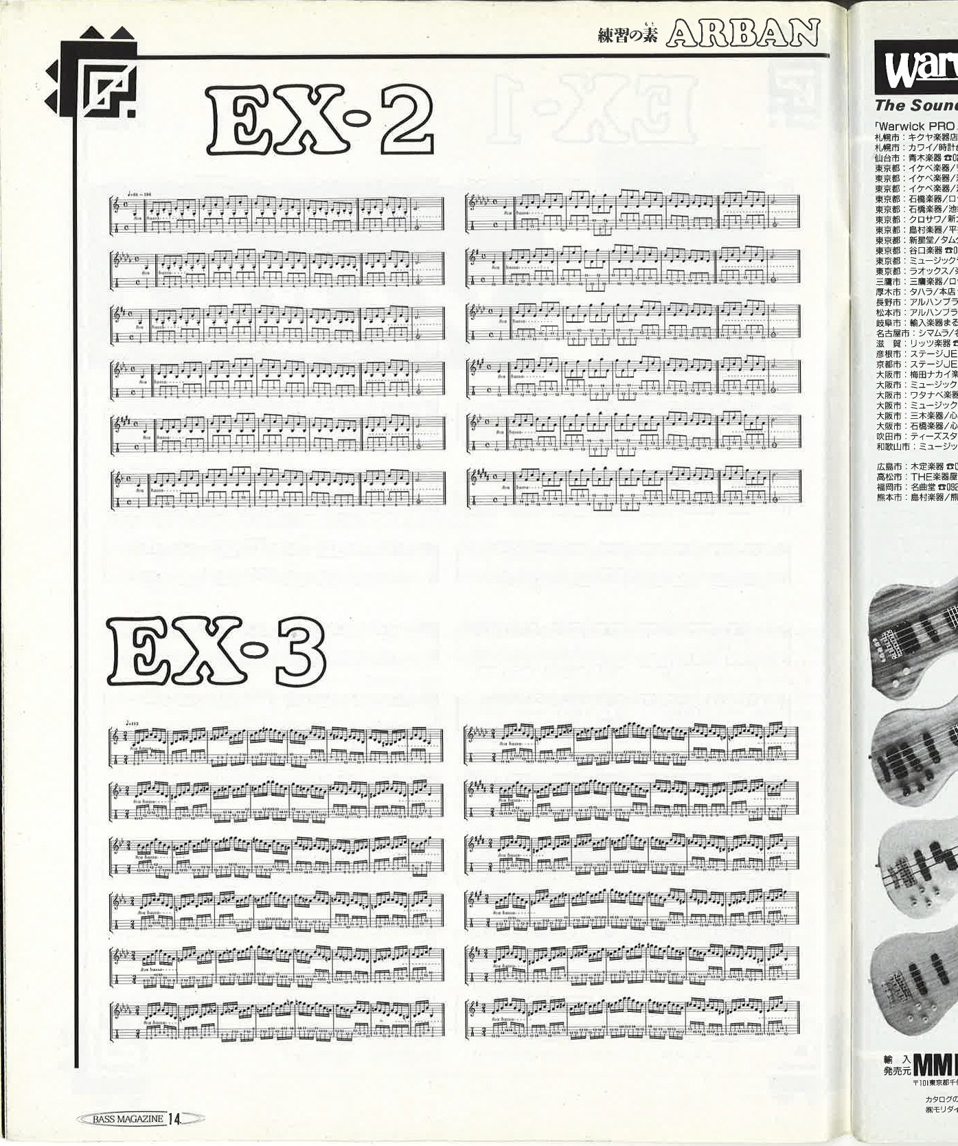 まあこの頃はバブル期ってヤツで、ベース・マガジンも天地のサイズが1メートルくらいありましたからねぇ......ってことはなくて、なかなかに衝撃的な"要拡大コピー"サイズです。もしかして気づいていないかもしれない方のために書いておきますが、EX-2、EX-3という文字の下にある古代遺跡の文様のようなものが譜例です。その譜例と反比例するかのように「EX-」の文字は異常なビッグサイズですが(笑)。そして都築さんはこんなことも書いています。