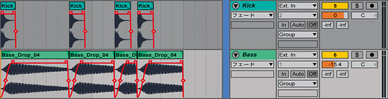 うまく描けたら、そのフェードをほかの個所のサブベースにも適用してみましょう。僕は普段ソフト・シンセでベースを作っていますが、一通り打ち込んだらオーディオ化してしまうため、こうした手法を採っています。同様の効果は、キックをトリガーとするサイド・チェイン・コンプによっても得られるものの、波形を見ながら作業できるこの手法の方が視認性に富んでいて好みですね。
