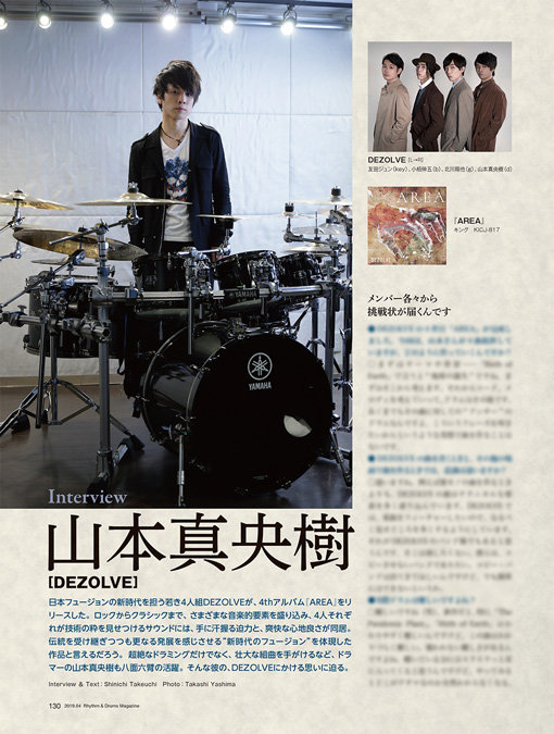 2/25(月)発売のリズム&ドラム・マガジン4月号では、気鋭の20代フュージョン・バンド=DEZOLVEのドラマー、山本真央樹にインタビュー。4thアルバム『AREA』について話を聞き、DEZOLVEにおけるドラミングと作曲についてのこだわりや、彼が紡ぐ "新世代フュージョン"の世界観に迫った。ここでは、本誌掲載のインタビューを一部抜粋してお届けしよう。