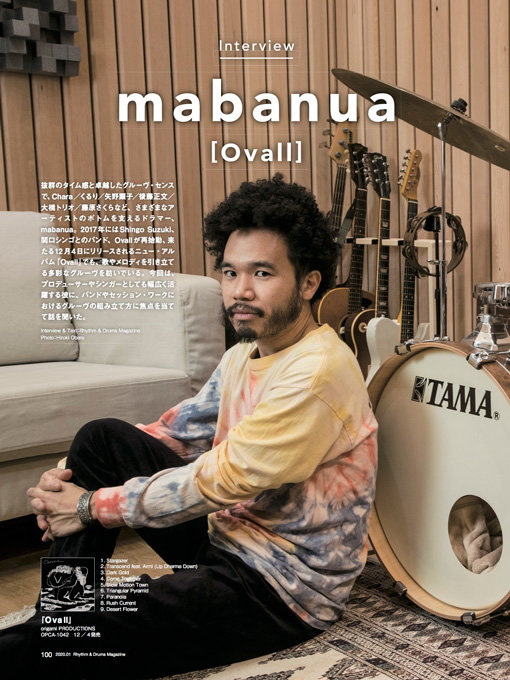 抜群のタイム感と卓越したグルーヴ・センスで、くるり/矢野顕子/大橋トリオなど、さまざまなアーティストのボトムを支えるドラマー、mabanua。リズム&ドラム・マガジン20年1月号に掲載となるインタビューでは、17年に再始動したShingo Suzuki、関口シンゴとのバンド=Ovallでリリースするニュー・アルバム『Ovall』と共に、バンドやセッション・ワークにおけるグルーヴの組み立て方について話を聞いた。ここでは、CharaやGotchとのエピソードを交えて語られた部分を抜粋してお届けしよう。