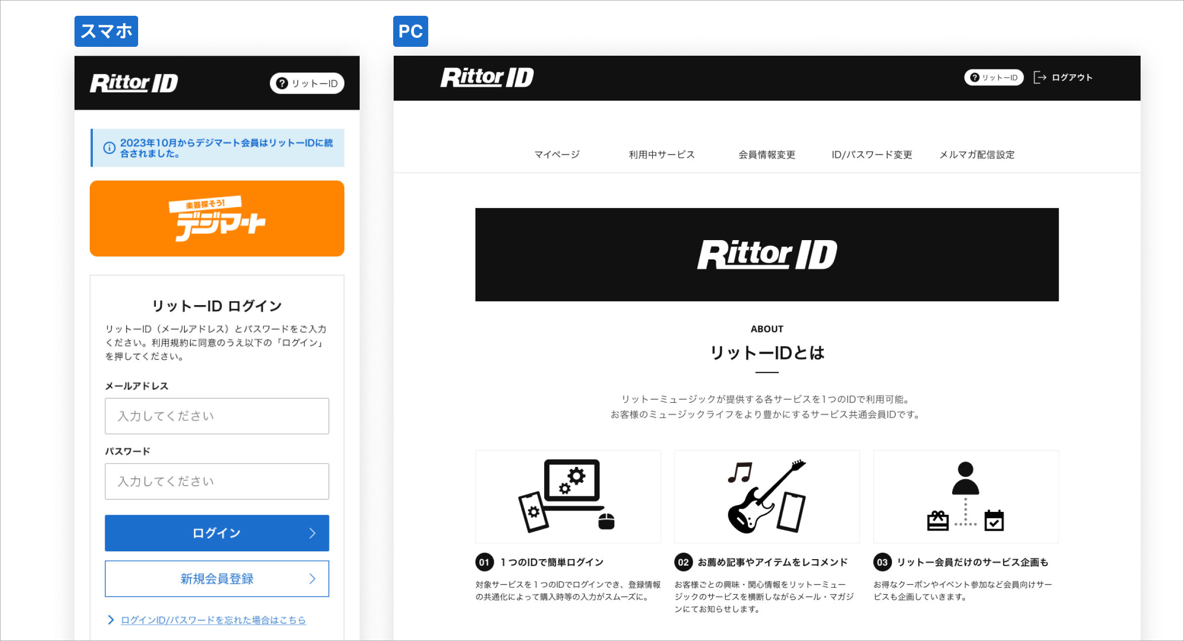 まずは2023年10月上旬、国内最大級・楽器ECモール「デジマート(digimart.net)」の「デジマート会員」をリットーIDに統合します(※1)。 今秋には「ギター・マガジンWEB(guitarmagazine.jp)」と「サンレコ(snrec.jp)」がリットーIDに加わり、その後もリットーミュージックが運営するサービスを順次統合していきます。