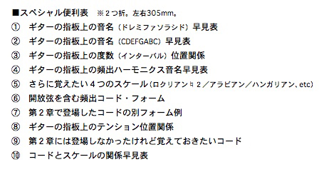 他にもギターの指板上の音名(ドレミファソラシド/CDEFGABC)、度数、頻出ハーモニクス音名、テンション位置関係、コードとスケールの関係早見表などなど、スケールやコード使いに役立つ情報満載。困った時に辞書的に使える一生役立つスケール&コード本です! 百聞は一見にしかず、何はともあれ、まずは上のURLから立ち読みしてみてください。