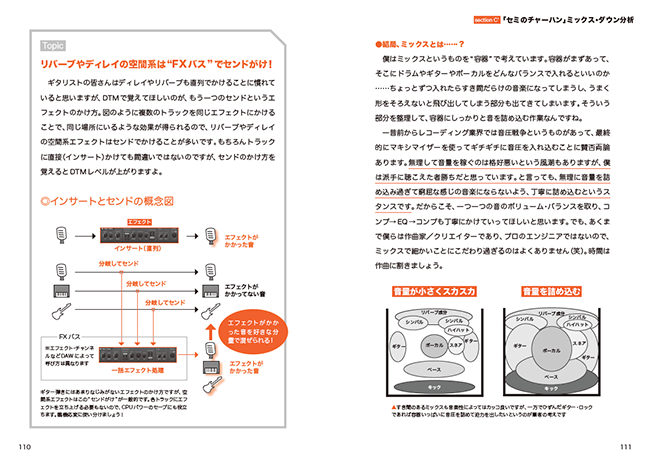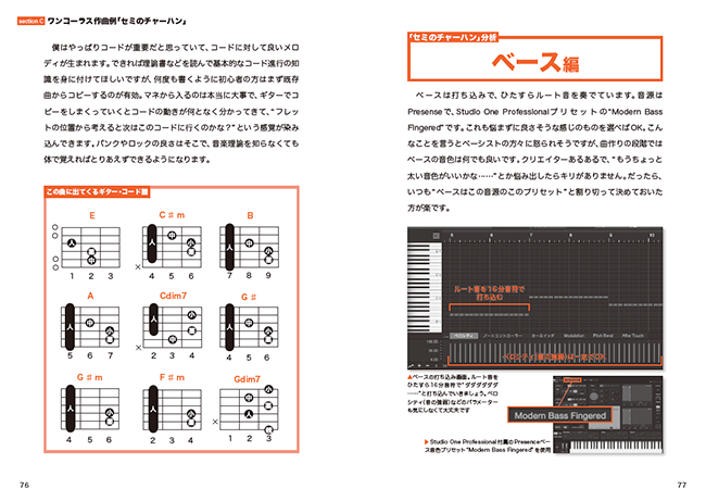 最初から1曲作り込む正攻法ではなく、ここで紹介するのは「ワンコーラス作曲法」。繰り返し作業することで作曲/DTMスキルが上達していくメソッドです。「細かいことにこだわらずにとにかく作る!」「リファレンス(見本曲)をマネすべし!」など、主にギタリストに向けた新感覚の入門書となっています。