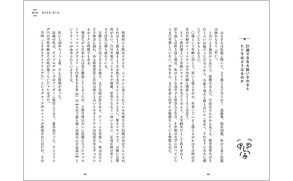 『若いカワイイからの卒業』はそんな遠藤氏の初エッセイ。noteに投稿されSNS上で大きな話題となった「アイドル時代にピルを知っておきたかった」「21歳でBBA扱いされるとヒト♀はどうなるのか」などの再録のほか、アイドル時代の赤裸々エピソード、誰もが参考にできそうなセカンドキャリアの選び方、仰天の整形エピソード(実体験)などが綴られた新録コンテンツも充実しています。