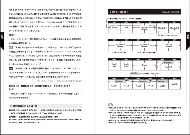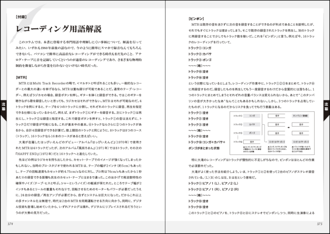 また、本文の技術解説を補うため、当時のテープ・レコーディングなど基礎的な知識をまとめた「レコーディング用語解説」ページも収録。【ピンポン】【パンチ・イン/アウト】【作先】【リズム録り】【ハーモナイザー】など、本文で頻出する専門用語をカバーする。