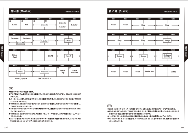『A LONG VACATION』『NIAGARA TRIANGLE Vol.2』『NIAGARA SONG BOOK』といった、この期間に大滝が作り上げた作品の中から、数多くのトラック・シート図を掲載。どのトラックにどの楽器パートが録音されていったのか、コアなファンのみならず、当時のレコーディングに興味のある世代にも貴重な資料となるはず。またCM曲や他アーティストのプロデュース曲のトラック・シートも豊富に用意し、大滝ならではの録音マジックを分析していく。