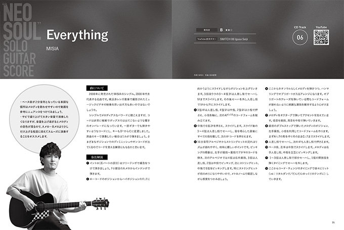 今、注目のジャンルの1つ、“ネオソウル”。グルーヴィかつおしゃれでカッコ良いサウンドが人気となり、ネオソウル・アレンジによるギター演奏がブームとなっています。このジャンルはエレキ・ギターで演奏されることが多いのですが、今回はアコースティック・ギターで弾くことができるよう、ギタリストの井草聖二さんにアレンジしてもらいました。いわゆるソロ・ギターのテクニックに加え、ネオソウルならではの奏法も加わっているので、難易度が高めかもしれません……。でも演奏できたら絶対ワクワクする!と思えるカッコ良いアレンジなので、ぜひ皆さんにチャレンジしてもらいたいです。本書付属CDでは全曲アコースティック・ギターで演奏してもらいましたが、YouTubeの連動動画では一部、フルアコで奏でてもらっているので、付属CDとの違いも楽しめるようになっています。