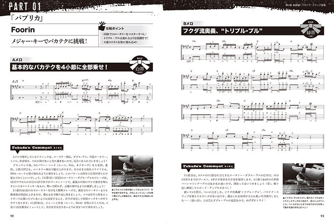 スラップ基礎テクニックの再確認から、超絶スラップの習得用エクササイズ、Suspended 4thでのスラップ実用例などをとおして、フクダのスラップ・テクニックに近づく方法論をレクチャー。書き下ろしコンテンツの一部は、web上での視聴形式による動画対応となっており、読んで、観て、聴いて学ぶことができます。