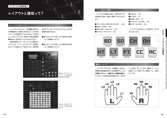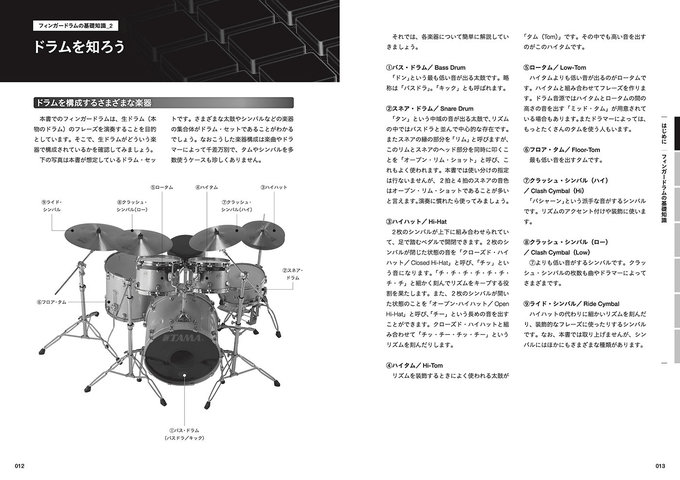 本書では、フィンガードラムと生ドラムのセットとの共通項や、フィンガードラムを叩く際の指の配置といった基礎的な知識も解説しています。