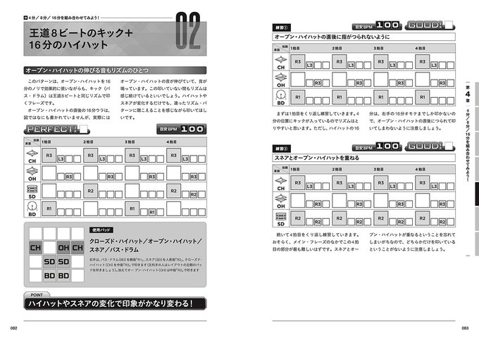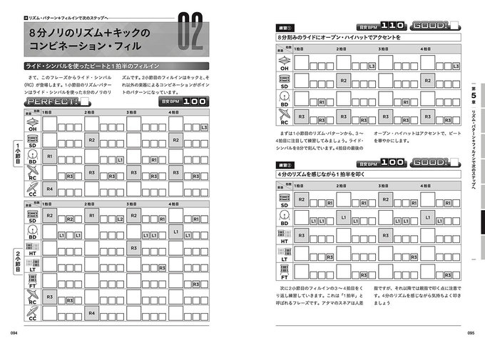 『第5章 リズム・パターン+フィルインで次のステップへ』より。終盤では難易度も増していきますので、演奏できるようになったときの達成感もひとしおです。