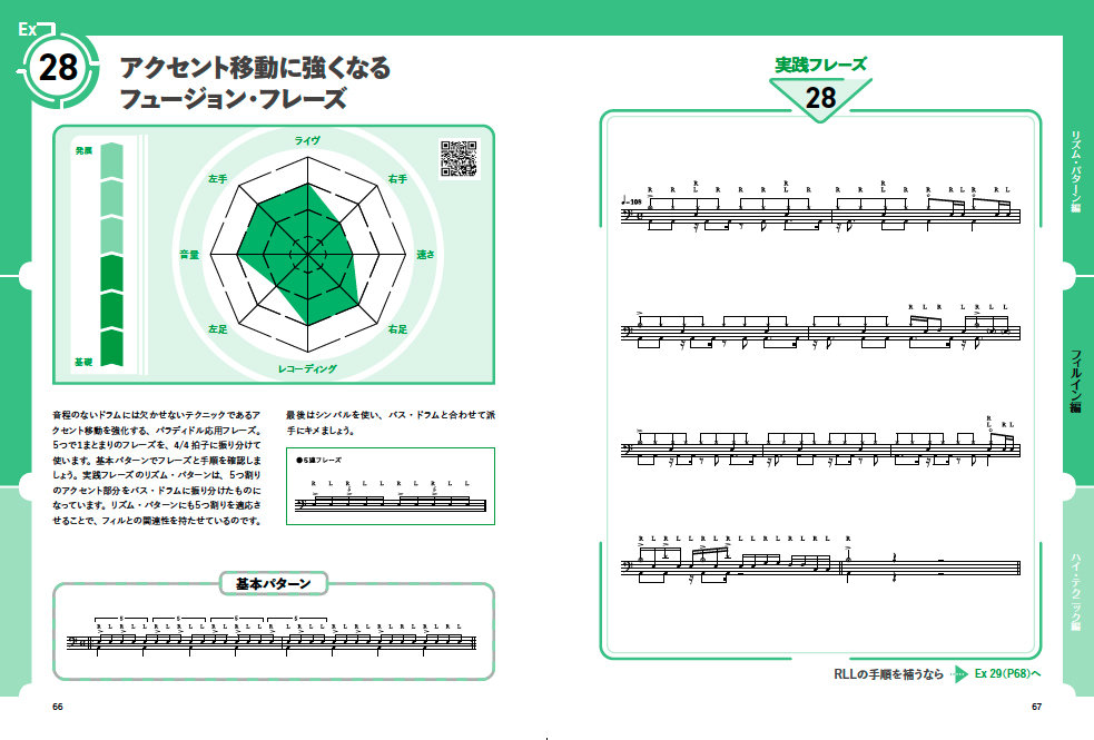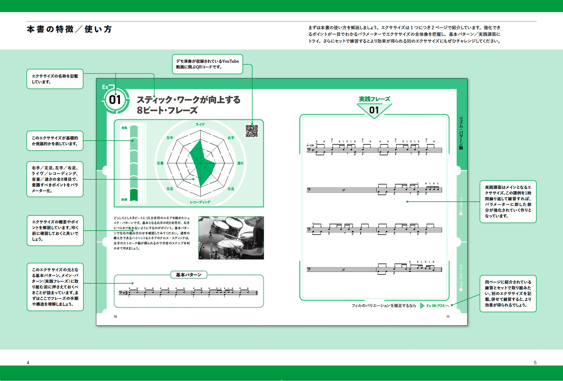 スティック・コントロール、手足の強化、アクセント移動......ドラムの練習は地味で"耐えるもの"という印象を持っている方も多いと思いますが、本書では"スタジオに入って、このフレーズだけ1時間叩き続ければ、確実にドラムがうまくなる!"をコンセプトに、短時間/反復練習でグングン上達する"タネ"をカテゴリ別で55フレーズ用意しました。さらに、練習すべきポイントがわかるパラメーターでエクササイズの内容も理解しやすく、全フレーズ動画対応なので、"このメニューは何が強化できるのか?"がすぐにわかります。苦手をなくしてバランス良くドラムがうまくなりたい......そんなドラマーには必携の書と言えるでしょう。