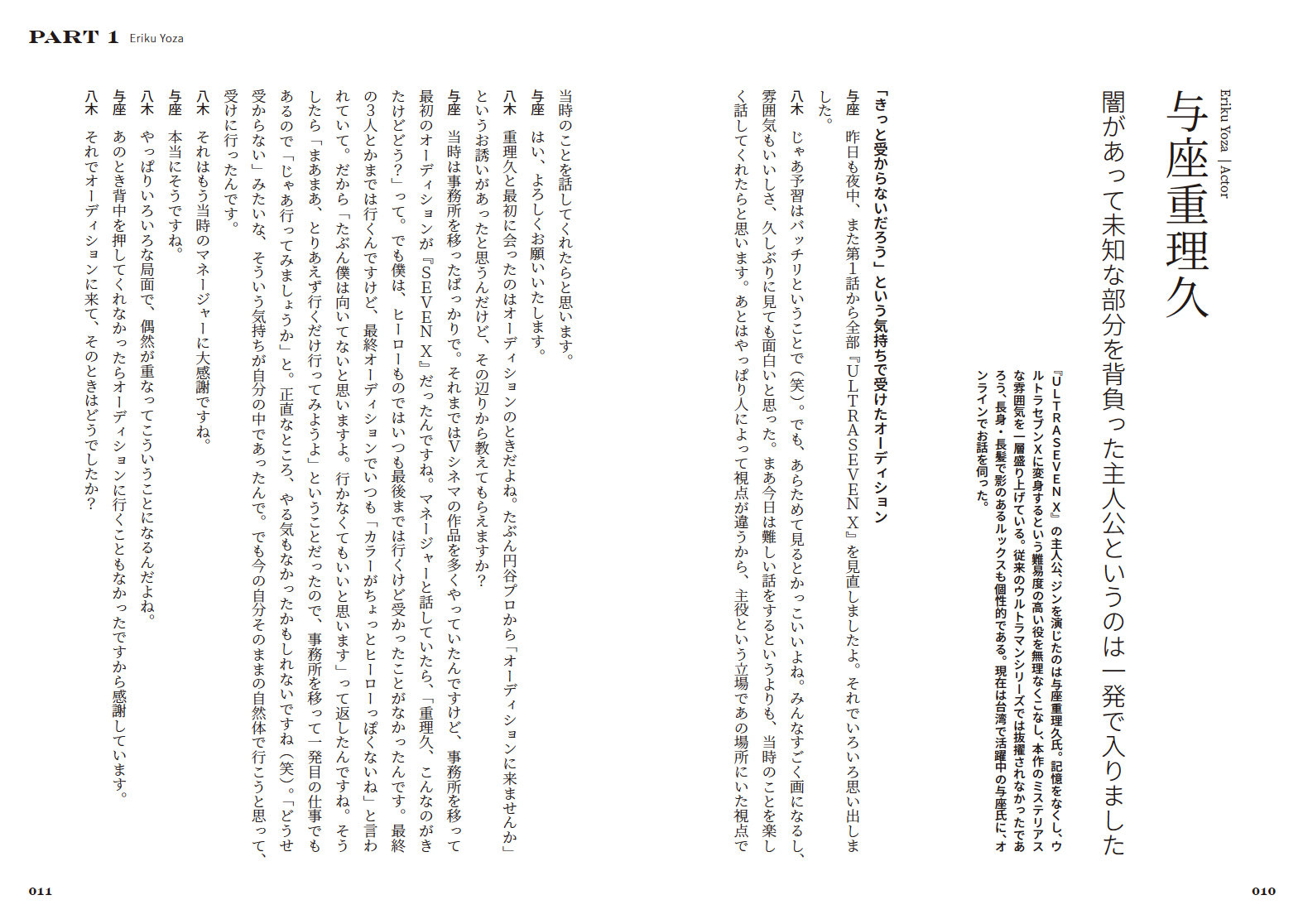 『ウルトラセブン』放映40周年を記念して製作された『ULTRASEVEN X』は、メイン監督とシリーズ構成を八木毅氏が務め、SFやホラー、怪奇テイストに溢れた作風が特徴となっている。深夜枠だからこそ可能となった「大人向け」の異色『ウルトラ』作品は、いかにして構想され、撮影されていったのか。主要キャスト4名に加え、プロデューサー、監督、脚本家、デザイナー、作曲家、スクリプター、カメラマン、照明技師、アクション監督、スーツアクター、CGチームの面々がその創作の舞台裏を明かす。さらに最終話に出演したオリジナル『セブン』のダン(森次晃嗣)とアンヌ(ひし美ゆり子)も参加し、『SEVEN X』のみならず『セブン』の思い出までを披露。八木監督だからこそ聞き出すことができた、秘話が満載の証言録です。