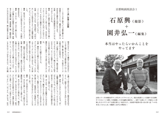 「京都映画座談会1」は、シリーズ第1作から技師として参加している大ベテラン石原興(撮影)、園井弘一(編集)、両氏の対話。『必殺仕置人』第1話「いのちを売ってさらし首」の詳細も解説