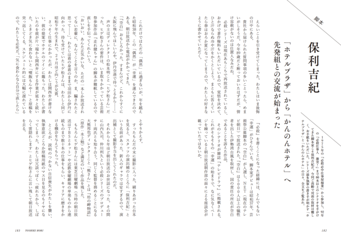 シリーズを通して80本以上のシナリオを手掛けた保利吉紀氏は、かかわるようになったきっかけや「あの著名監督」との関係、脚本家同士の交流などを詳細に記述した貴重な原稿を寄稿