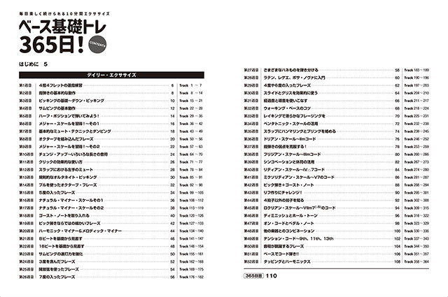 現代のベーシストに必要とされる項目は多岐に渡ります。指弾きorピック弾きの使い分け、スラップ、各種奏法、多ジャンルへの対応力、グルーヴのコントロール、スケールやコードへの対応力etc・・・。これらの基礎力を1年間365日で身につけようというのが本書です。