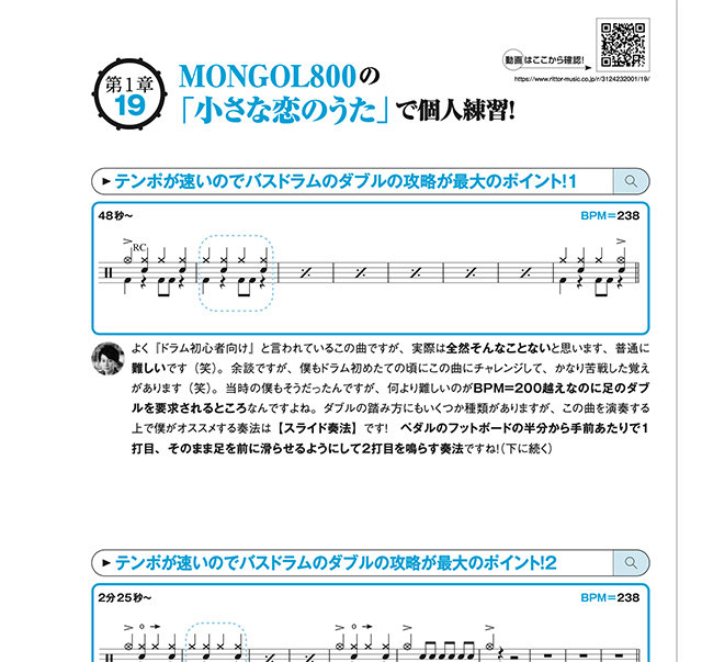 YouTubeのドラム演奏動画が好評のだいち氏が、人気曲の実際のドラム演奏から「1曲につき4小節のドラム譜2~3本ずつ」ドラムの個人練習に向いたフレーズをピックアップ。すべてだいち氏による練習ポイントや効能の解説付きです。登場フレーズは初心者向きの比較的難度の低いものから中級者向きまでで、すべてだいち氏の個人チャンネルで動画確認も可能。実際の曲で使われているフレーズなので、よくありがちな「練習するための練習」ではなく「実際の演奏で使える練習」としてオススメです。人気曲のフレーズも覚えられるので楽しみながら上達できます。総合練習用に人気曲の1曲丸ごとドラム譜例も数曲掲載! 「個人練習、何をすればいい?」と悩んでいた人にもぴったりなドラム上達に役立つ個人練習ネタが詰まった1冊です。