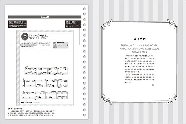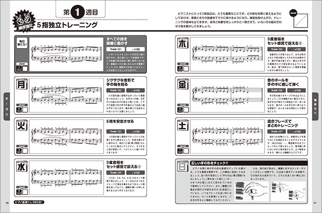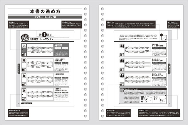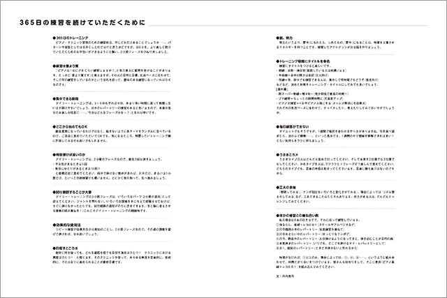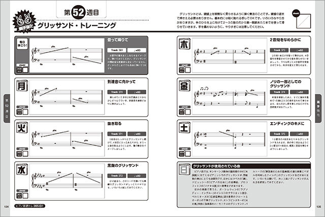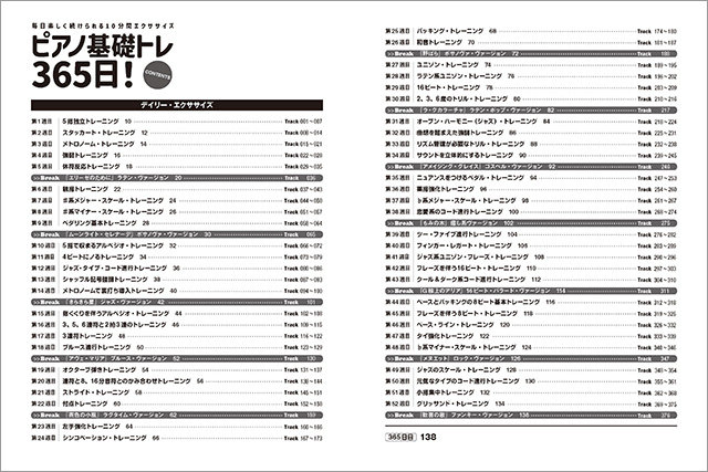 あらゆるテクニック、幅広いジャンルを身につけるには、練習素材の選定とモチベーション管理が重要です。しかし、ピアノ独習者にとって、これらを習得することは、かなり難しい課題と言えます。そこで活用したいのが本書。本書は、1年=365日分の基礎練習を収録したピアノ教則本となっています。週ごとに練習テーマが設定され、月~土曜日には毎日異なる各2小節の短いフレーズを練習。日曜日にはその週を振り返って復習をするという効率的な構成になっているのがポイントです。これなら、高いモチベーションを維持したまま、計画的に取り組むことができます。しかも、練習フレーズは、各種テクニックやジャンルの基礎となる王道的なものばり。また、トレーニングの効果を確かめながら楽しめる、ジャンル別のアレンジ曲を12曲収録。4〜5 週に1 度息抜き感覚で、 さまざまなジャンルにアレンジされた曲を楽しく弾くことができます。本書に沿って1年間の練習を続ければ、驚くほどの演奏力が身についていることでしょう。