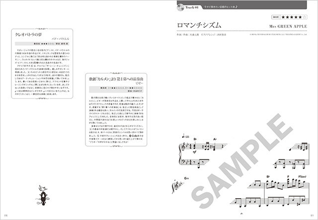 Mrs. GREEN APPLEの9作目シングル「ロマンチシズム」、『劇場版「鬼滅の刃」無限城編 第一章 猗窩座再来』主題歌「残酷な夜に輝け/LiSA」 などの人気曲をはじめ、洗練されたカッコ良さで高い評価を受けているシティ・ポップからは「SPARKLE/山下達郎」、クラシック曲からは、ポーランドが生んだ天才作曲家ショパンの「ピアノ協奏曲第1番第2楽章」を発表会でも映えるアレンジに仕上げました。そのほか、上質なジャズにアレンジした「シェナンドー」や、連弾アレンジした「歌劇 『カルメン』より 第1幕への前奏曲/ビゼー」など、弾きたい曲が必ず見つかる名曲揃いです。