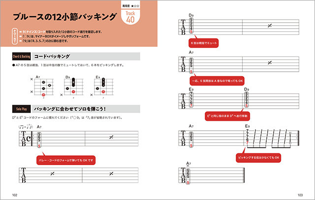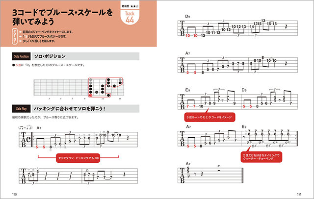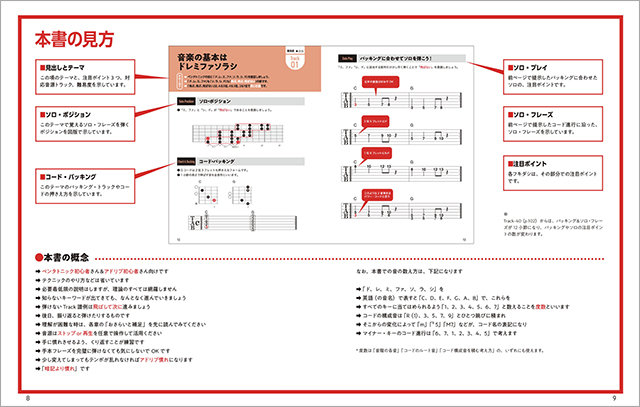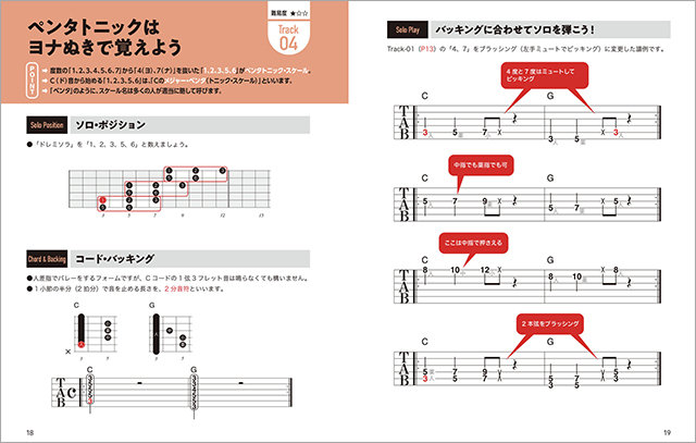 本書の最大の特長は、定番コード進行に合わせたフレーズ例を豊富に掲載している点。左ページに伴奏&バッキングとソロのポジション解説、右ページにペンタを使った実践ソロを配置。吹き出しコメントで直感的に理解できるレイアウトになっているので、音楽的センスや経験が浅くても心配無用! 解説は最小限なので、解説や譜面を読むのが苦手でも安心!