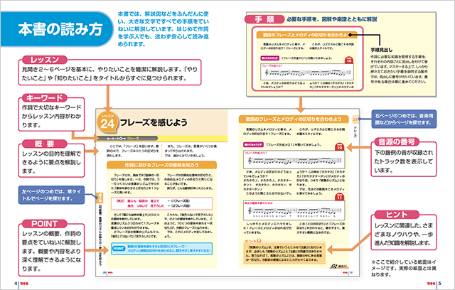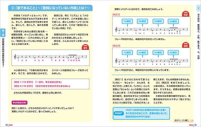 そんな悩みを持つ人のために、例題や練習問題をとおして、作詞の完成度と実力を磨ける1冊となっています。また、実際に歌詞をつけた音源を聴いて、完成形を確認できるのも、本書ならではの特長です。