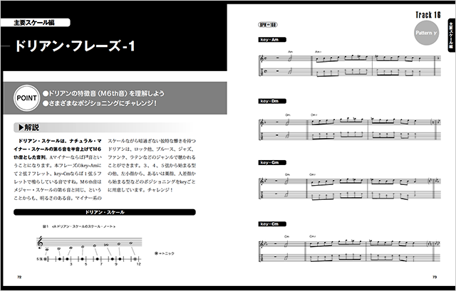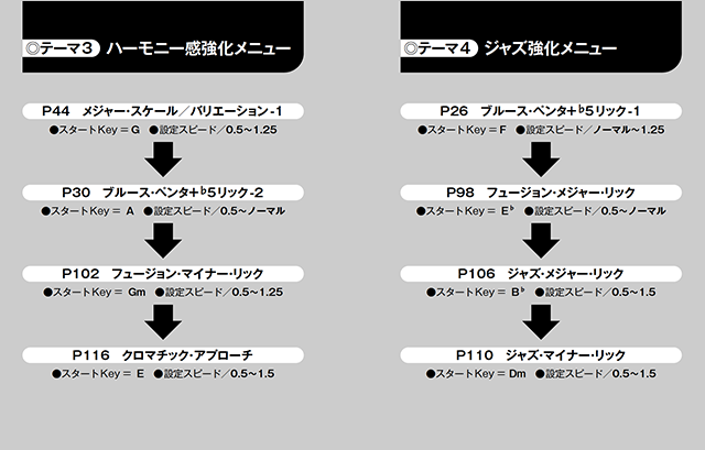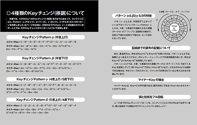 キー移動のパターンは、単純な半音移動だけでなく、より実践的な「4度や5度での移動」も収録。指先と耳を余す所なく刺激し、演奏力を総合的に押し上げます。